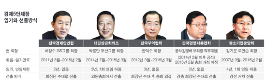 [천지일보=유영선 기자] 경제5단체장의 임기가 내년 초 일제히 종료되면서 차기 회장에 누가 선출될지에 관심이 쏠린다. 전국경제인연합회, 대한상공회의소 등 5단체장의 임기가 동시에 끝나는 것은 이번이 처음이다.