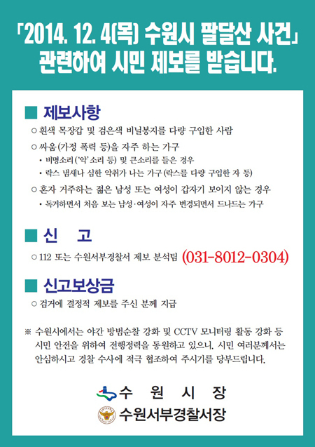 8일 오후 3시 수원시 서부경찰서의 협조로 동별 통장회의를 열고 이번 팔달산 사건과 관련해 시민들의 적극적인 제보를 이끌어내기 위해 수원시 전역에서 오후 7시 임시반상회를 연다고 밝혔다.