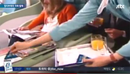 한편 9일 모 방송사에서는 대한항공의 홍보영상을 공개하면서 대한항공 영상 속 승무원들이 땅콩을 봉지째로 승객에게 제공하고 있다고 꼬집었다. 영상에서 승무원들은 마카다미아넛의 ‘마우나로나’를 일등석 승객에게 봉지째로 음료와 함께 제공하고 있다.