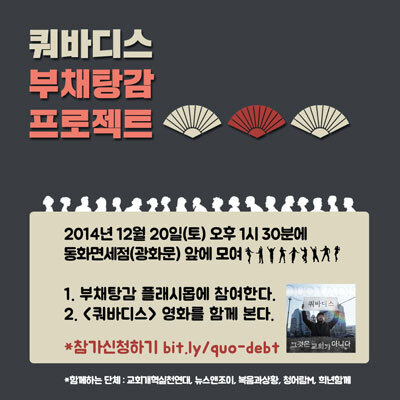 이번 프로젝트의 일환으로 오는 20일 오후 1시 30분 광화문 동화면세점 앞 스폰지하우스에서는 관련 행사가 진행될 예정이다. 이날 부채탕감 플래시몹, 부채소각 퍼포먼스, 쿼바디스 영화 상영 순으로 행사 프로그램이 계획됐다. 이번 행사에는 교회개혁실천연대, 뉴스앤조이, 복음과상황, 청어람M, 희년함께 등 5개 개신교 단체가 참여한다.
