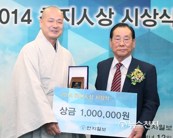 [천지일보=박준성 기자] 천지일보(대표 이상면)가 주최하는 제5회 천지인상 시상식이 15일 오전 11시 서울 용산구 코레일유통 5층 회의실에서 열렸다. 이기철 국제기독교선교협의회 총재가 종교인상 수상자 문화재제자리찾기 대표 혜문스님에게 상을 수여하고 있다. 혜문스님은 6.25전쟁 당시 사라진 ‘황제지보’를 비롯한 대한제국 국새 및 조선왕실인장 9점을 오바마 대통령을 통해 직접 돌려받는 유례없는 일을 이끌어냈다. 또 문화재제자리찾기 운동으로 우리 민족의 역사와 문화를 지키는 데 있어 종교와 계층 간의 벽을 허물고 화합의 장을 마련한 공로를 인정받아 수상자로 선정됐다.