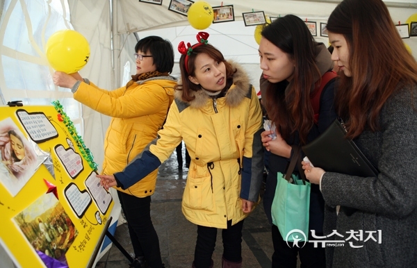 ▲ 23일 청계광장에서 열린 ‘산타 패션쇼’의 크리스마스 체험부스에 참여한 시민들이 행사 진행자에게 설명을 듣고 있다. ⓒ천지일보(뉴스천지)
