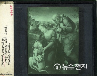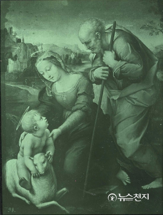 본지는 정성길 계명대 동산의료원 명예박물관장으로부터 유리원판 필름에 담긴 라파엘로 작품을 입수했다. 부모 요셉과 마리아가 사랑스럽게 지켜보는 가운데 아기 예수가 발가벗은 채 양을 타고 있는 그림이다. 뒷배경은 예루살렘으로 보이며 아기 예수의 목에는 목걸이가 걸려 있다. 살아있는 듯한 선이 돋보이고 입체감을 느낄 수 있는 라파엘로의 작품이다.