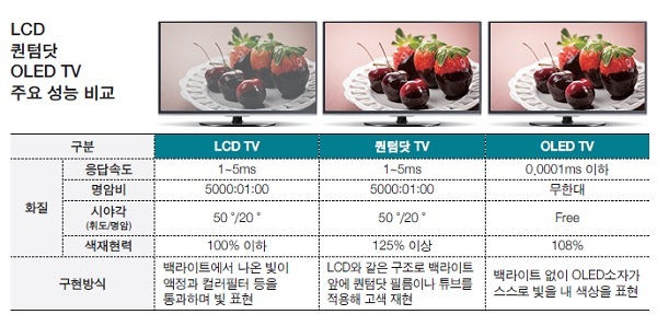 [천지일보=이승연 기자] 디스플레이의 진화는 확실히 LCD(액정디스플레이)를 넘어 OLED(유기발광디스플레이)로 가고 있다. 하지만 내년 시장에서는 LCD의 파생 제품인 퀀텀닷(Quantum dot, 양자점) TV와 OLED TV가 치열한 주도권 싸움을 벌일 전망이다.