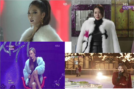 이러한 인기는 가요계뿐만 아니라 드라마에서도 예외가 아니다. SBS ‘미녀의 탄생’에서 남다른 패션 스타일로 사랑 받고 있는 왕지혜도 풍성한 화이트 퍼와 플라워 모양이 화려하게 수놓아져 있는 퍼로 아름답고 고급스러움을 연출 했다.