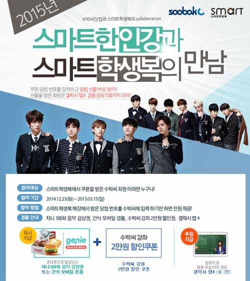 이에 따라 수박씨닷컴은 전국 217개의 스마트학생복 매장에 수박씨 이벤트 쿠폰을 비치하고 방문 고객에게 무료로 배포한다.