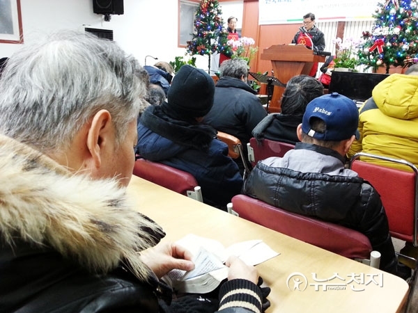 [천지일보=강수경 기자] 한국교회연합(한교연, 대표회장 양병희 목사)와 (사)해피나우(이사장 길자연 목사) 등 한국교회가 지난 1일부터 3일까지 서울역 ㈔참좋은친구들에서 노숙자 무료급식 행사를 진행하고 있다. 급식에 앞서 진행된 예배에서 한 노숙인이 성경을 찾아 유심히 보고 있다.