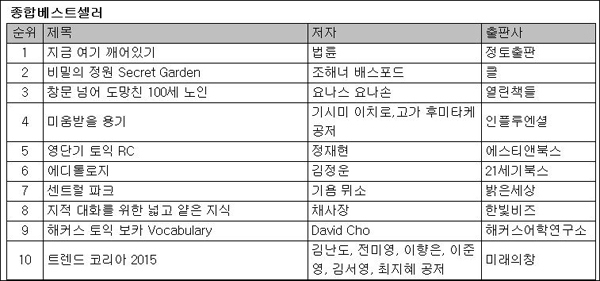 ‘지금 여기 깨어있기’에 이어 어른들을 위한 컬러링북 ‘비밀의 정원 Secret Garden’이 지난주 3위에서 한 계단 올라 2위에 자리했다. 요나스 요나손의 ‘창문 넘어 도망친 100세 노인’은 한 계단 떨어져 3위를 기록했고, 기시미 이치로, 고가 후미타케의 심리학 도서 ‘미움받을 용기’는 4위를 유지했다.