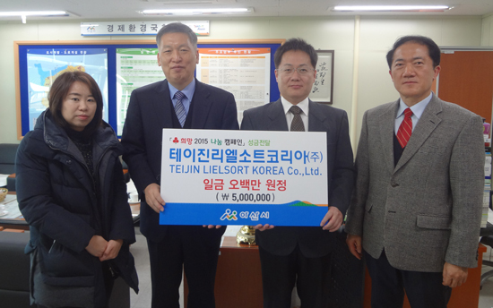 [천지일보 아산=박주환 기자] 충남 아산시 둔포면 테이진리엘소트코리아㈜(대표이사 오우츠 카즈조)가 지난 8일 아산시를 방문해 희망2015 나눔캠페인 이웃사랑 성금 500만을 전달했다.