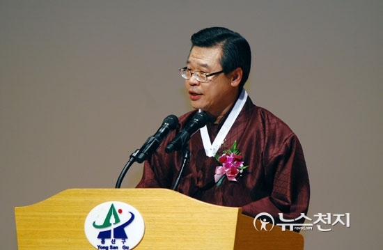 ▲ 9일 용산아트홀 대극장에서 열린 2015신년인사회서 성장현 용산구청장이 인사말을 하고 있다. ⓒ천지일보(뉴스천지)