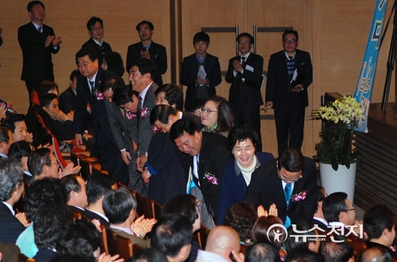 ▲ 9일 용산아트홀 대극장에서 열린 2015신년인사회서 용산구의원들이 단체로 구민들에게 인사를 하고 있다. ⓒ천지일보(뉴스천지)