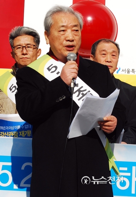 [천지일보=장수경 기자] ‘5.24조치 해제를 위한 경협·종교·시민단체 연대’가 13일 오후 서울 종로구 광화문광장에서 ‘5.24조치 해제, 금강산 관광 재개 촉구 남북경협기업인 선언 및 기자회견’을 개최했다. 김정태 안동대마방직 회장이 경제인발언을 하고 있다.