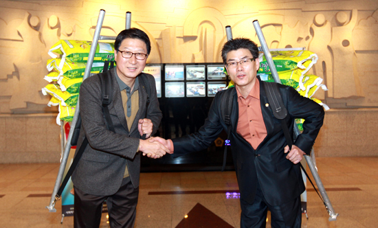 [천지일보 경기=강은주 기자] 경기도의회 양 교섭단체 오완석 새정치민주연합 수석부대표와 윤태길 새누리당 수석부대표가 14일 경기도의회 로비에서 쪽방촌 어르신을 돕기 위한 라이스 버킷 챌린지에 동참했다.