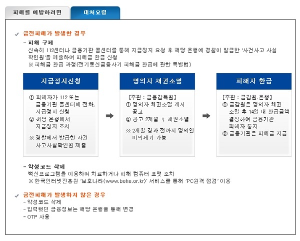 *파밍: 악성코드에 감염된 사용자PC를 조작해 금융정보를 빼내는 것. 일반적으로 ①사용자PC가 악성코드에 감염됨 → ②정상 홈페이지에 접속하여도 피싱(가짜)사이트로 유도 → ③금융정보 탈취 → ④범행계좌로 이체 순으로 이뤄짐.