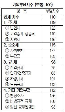 항목별로 보면 ‘조세부담’이 119로 가장 컸고, 이어 사회보험 등 ‘준조세부담’이 115로, ‘기타 기업부담’이 112로 조사됐다. ‘규제부담’은 93으로 조사됐으나 세부항목 중 노동, 환경규제 부담은 높은 것으로 나타났다.