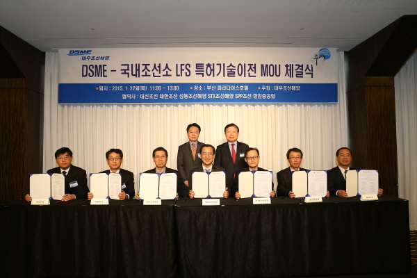 대우조선해양은 지난 22일 부산 해운대 파라다이스호텔에서 국내 조선소들과 특허기술 이전 양해각서(MOU)를 체결하고 LNG연료 추진 선박(LFSO)의 설계 및 엔지니어링 기술이전을 추진키로 했다.