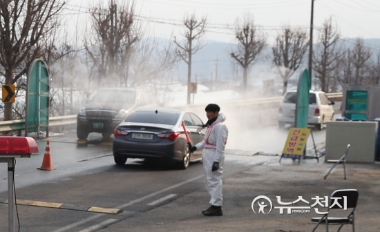 [천지일보 천안=박주환 기자] 지난 23일 충남 천안시 동남구 병천면의 한 양돈 농가에서 구제역 의심신고가 접수된 가운데 24일 천안시 등 방역당국이 천안으로 진입하는 주도로인 동면 동산리 방역초소에서 방역을 실시하고 있다.