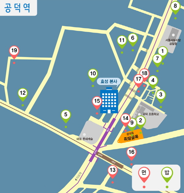 효성은 먼저 본사서 근무하는 효성 임직원들의 추천을 받아 음식점을 엄선해 ‘마포 공덕동 맛집 지도’를 공개했다. 마포구는 갈비구이·간장게장 등 맛집이 밀집해 있어 효성 직원 뿐 아니라 페이스북을 통해 맛집 지도를 접한 소셜팬들에게도 큰 인기를 끌고 있는 것으로 전해졌다. 효성은 향후 반포·청담 등 서울지역 사업장과 구미·창원 등 지방 사업장의 ‘맛집 지도’도 제공할 예정이다.
