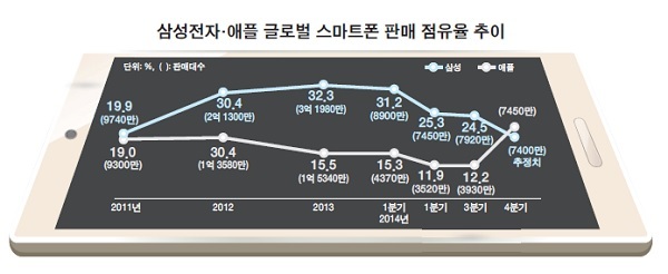 이에 따라 올해는 삼성과 애플의 1위 경쟁이 더 치열해질 전망이다. 삼성은 프리미엄과 보급형이라는 투트랙 전략을 구사할 것으로 보인다. 프리미엄 라인으로는 중국, 미국 등에서 애플에 응수하고 보급형을 통해서는 빠르게 성장하는 3위권 사업자들을 견제한다. 오는 3월 공개될 프리미엄 전략폰 갤럭시S6의 성공여부가 향방을 결정짓는 키가 될 것으로 보인다.