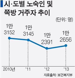 보건복지부의 ‘시·도별 노숙인 및 쪽방 거주자 추이’ 자료에 따르면 지난 2010년 1만 3152명에서 2011년 1만 3145명, 2012년 1만 2391명으로 감소했다가 2013년 1만 2656명으로 다시 증가했다. 이중 요양시설이나 임시 보호시설에 들어가지 않은 노숙인은 1460여 명으로 추정된다.