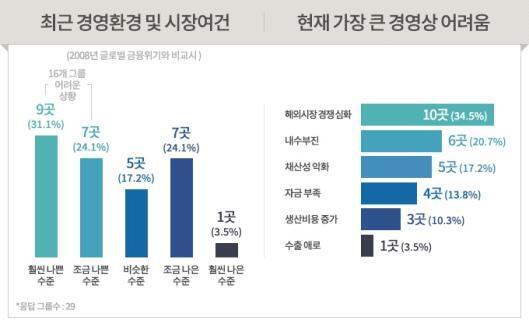 현재 그룹들의 경영상 가장 큰 어려움은 ▲해외시장 경쟁 심화(34.5%)와 내수 부진(20.7%)인 것으로 조사됐다. 이어 ▲채산성 악화(17.2%) ▲자금 부족(13.8%) ▲생산비용 증가(10.3%) ▲수출 애로(3.5%) 등이 뒤를 이었다.