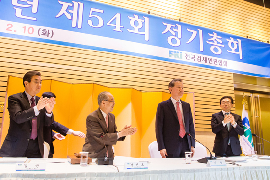 전경련은 10일 서울 여의도 전경련 회관에서 강신호 회장, 김윤 회장 등 회원기업 대표 200여명이 참석한 가운데 ‘제54회 정기총회’를 열고 허창수 회장을 차기 전경련 회장으로 재선임했다.