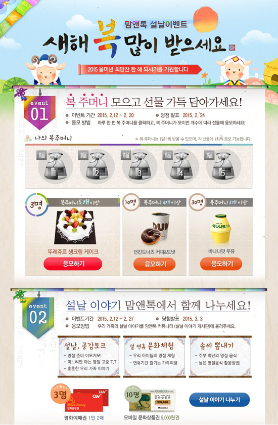 오는 20일까지 맘앤톡 사이트에서 하루 한 번 복주머니를 클릭하고, 누적된 복주머니 개수에 따라 해당 선물에 응모하면 추첨을 통해 딸기티라미수 케이크(3명), 도넛세트(10명), 바나나맛 우유(30명) 교환권을 보내준다. 당첨자는 24일 발표된다.