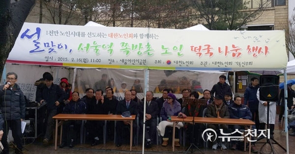 지난 16일 서울 용산구 동자동 새꿈어린이공원에서 설맞이 서울역 쪽방촌 노인 떡국 나눔행사가 펼쳐졌다.