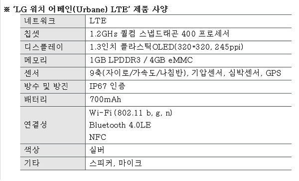 [천지일보=이승연 기자] LG전자가 ‘LG 워치 어베인’을 두 가지 버전으로 선보인다. LG전자가 오는 3월 스페인 바르셀로나에서 열리는 ‘MWC 2015(모바일 월드 콩그레스 2015)’에서 고급 시계의 느낌을 살린 LG워치 어베인과 함께, 세계 최초로 LTE 통신 기능을 탑재한 스마트워치 ‘LG 워치 어베인(Urbane) LTE’를 첫 공개한다고 26일 밝혔다.