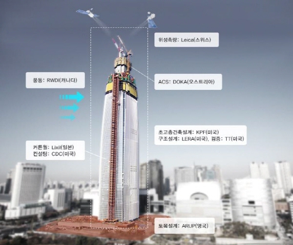 롯데월드타워 공사에 적용하고 있는 초고층 장비에도 세계적인 업체가 참여했다. 오차 없는 시공을 위해 4대 이상의 인공위성으로부터 측정정보를 받아 오차를 보정하는 위성측량시스템(GNSS)장비는 스위스의 Leica 사의 것이고, 별도의 해체 및 재설치가 필요 없이 유압장치에 의해 스스로 상승하는 ACS(Auto Climbing System)거푸집은 오스트리아 Doka사의 것이다.