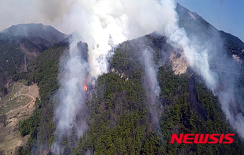 현재 산림헬기 7대와 소방차 10대, 공무원과 소방대원, 군 병력 등 550여명이 투입돼 진화 작업 중이다. 하지만 바람이 강하고 장비 접근이 어려워 화재발생 5시간이 넘도록 진화에 애를 먹고 있다.