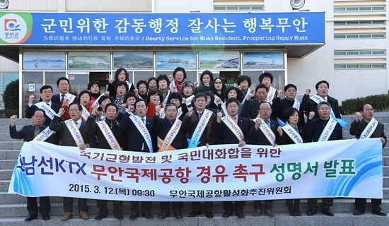 [천지일보 무안=김미정 기자] 국토교통부와 기획재정부가 호남고속철도 2단계 노선을 두고 상반된 의견을 내고 있는 가운데 무안군민들이 ‘무안국제공항 경유’를 촉구, 성명서를 발표했다.