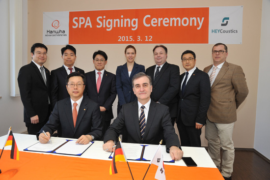 한화첨단소재 이선석 대표는 12일(현지시각) 독일 바이에른주 디트푸르트시에 위치한 하이코스틱스 본사를 방문해 기업 인수를 위한 협약을 체결했다.