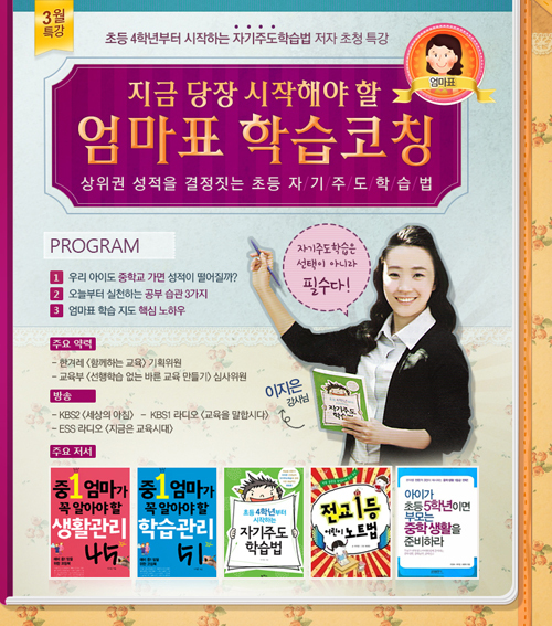 이 강사는 특강에서 ‘중학교 진학 후 성적 결정요인’, ‘오늘부터 실천하는 공부습관 3가지’, ‘엄마표 학습지도 핵심 노하우’라는 세부 주제로, 초등학교 고학년 자녀가 자기주도 학습을 시작할 때 유념해야 할 점과 부모의 역할에 대한 구체적인 조언을 들려줄 예정이다.