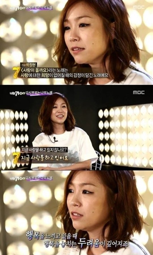 이어 사랑을 하고 있냐는 질문에 박정현은 “지금 사랑을 하고 있다. 지금 너무 좋은데 행복을 느끼고 있을 때 이 행복을 놓치는 두려움이 깊다”고 말해 눈길을 끌었다.