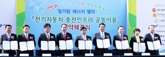 [천지일보=이태교 기자] 한국전력(사장 조환익)이 24일 광주송정역에서 광주광역시, 전라남도 등 9개 기관이 참석한 가운데 전기차 충전인프라 공동이용 협약식을 체결했다.