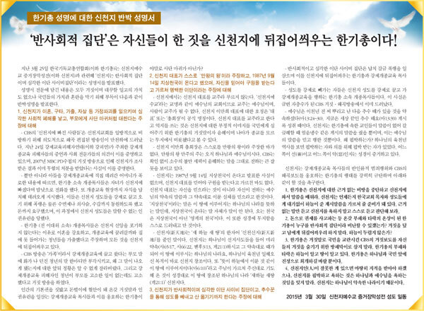 신천지 측은 30일 ‘반사회적 집단은 자신들이 한 짓을 신천지에 뒤집어씌우는 한기총이다!’는 제목의 성명서를 발표하고 지난 25일 발표한 한기총 성명서에 대해 반박했다.