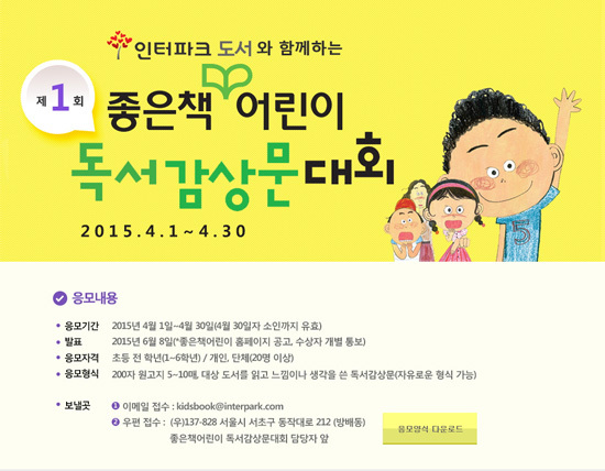 전국 초등학생 전 학년을 대상으로 하는 이번 독서감상문 대회는 개인으로 참가하거나 20명 이상의 단체로 참가 가능하다. 응모는 총 48종의 지정도서 중 1권 이상을 읽고 200자 원고지 8매 내외 분량의 독후감을 4월 30일까지 이메일(kidsbook@interpark.com)이나 우편으로 접수하면 된다.