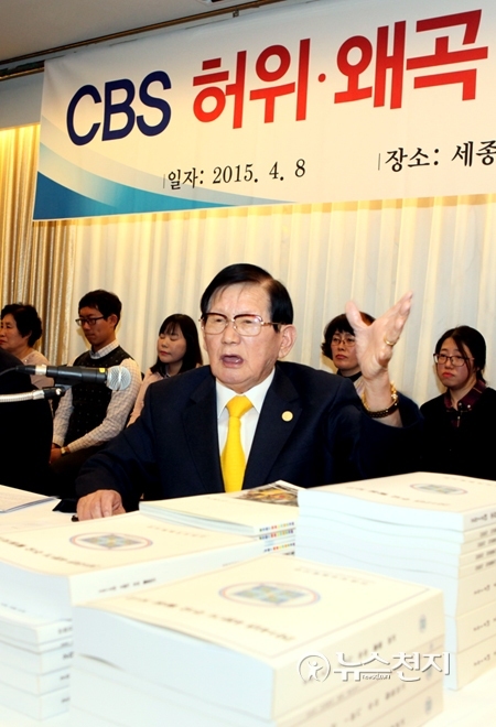 ▲신천지교회가 8일 서울 중구 세종문화회관 세종홀에서 CBS다큐 ‘관찰보고서-신천지에 빠진 사람들’에 대한 거짓·왜곡보도 규탄 기자회견을 열고, CBS의 대국민사과와 정정보도를 촉구했다. 신천지 이만희 총회장은 거짓·허위보도한 CBS를 강도 높게 비판했다. ⓒ천지일보(뉴스천지)