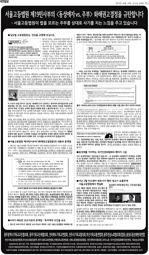 해당 광고는 서울고등법원 제19민사부(부장판사 노태악)이 지난 4일 ‘동성애 반대’를 주장해오던 시민단체 ‘건강한사회를위한국민연대’ 회원으로 활동하던 A씨가 ‘동성애자’라고 커밍아웃한 신문고뉴스 B기자의 실명과 사진 등과 함께 ‘에이즈·환각상태·성범죄’ 등의 글을 함께 올린 것에 대한 B기자의 손해배상 청구소송에 대해 법원이 화해권고 결정을 내린 것을 반대한다는 취지다.
