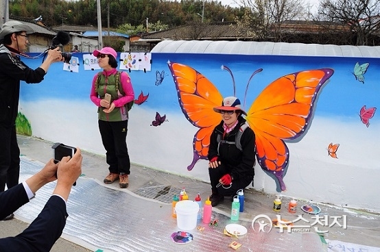 한편 12일 완성된 이천마을 제1담벼락은 2015 하계유니버시아드 홍보와 세계 만국기 열매가 그려진 나무, 나비 포토존 등이 자리를 잡았고 특히 나비 포토존은 행인들이 사진을 촬영하는 등 벌써 인기를 끌고 있다.