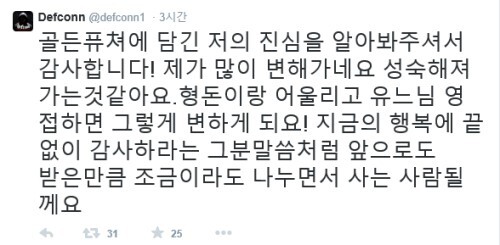 또한 데프콘은 “제가 많이 변해 가네요. 성숙해져 가는 것 같아요. 형돈이랑 어울리고 유느님 영접하면 그렇게 변하게 돼요! 지금의 행복에 끝없이 감사하라는 그 분 말씀처럼 앞으로도 받은 만큼 조금이라도 나누면서 사는 사람 될게요”라는 글을 올렸다.