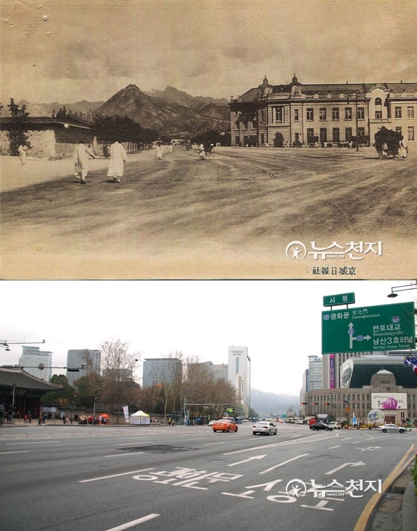 또한 현재 서울시청 자리에 있는 경성일보를 볼 수 있고, 왼쪽 담장안쪽으로는 덕수궁 대한문이 있다. 이곳은 1919년 고종황제 장례식 때 최대 군중들이 운집했던 광장이다. 아래사진은 현재의 모습이다.