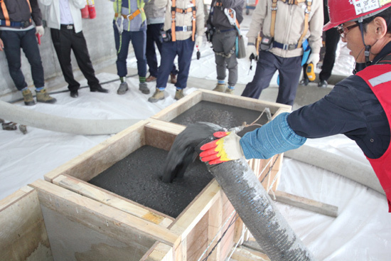 롯데건설은 지난 21일 잠실 롯데월드타워 현장에서 실물테스트를 통해 초고강도인 150㎫ 콘크리트를 국내 최초로 300m 높이 이상으로 한 번에 쏘아 올렸다.