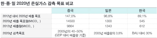 2020년 온실가스 감축목표를 각국의 2012년 배출실적과 비교하면 일본은 3.2% 감축이 필요하지만, 중국은 오히려 47% 초과 배출이 가능한 상황이다. 반면 우리나라는 2012년 배출실적에 비해 무려 10.1%나 감축해야 한다.