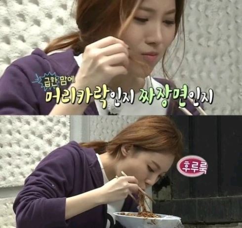 유라와 강남은 벽화를 그리던 도중 자장면을 배달해 먹었다. 음식이 도착하자마자 유라는 자장면을 그릇째 들고 먹기 시작했다.