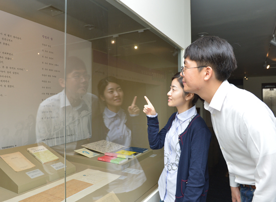 [천지일보=김민아 기자] 한양대 박물관이 25일 서울 성동구 전시실에서 개최한 박목월(朴木月, 1915~1978) 선생 탄생 100주년 기념 특별전 ‘구름에 달 가듯이’에서 관람자들이 목월 선생의 시를 보고 있다. 박목월 선생은 1960년부터 사망할 때까지 한양대 국문과 교수 겸 인문대학장으로 18년 재직했다.