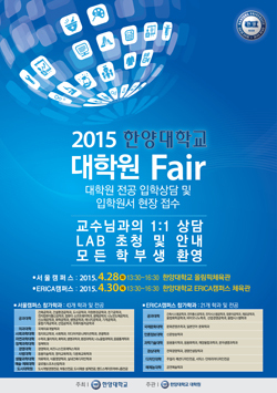 대학원 전공 소개 박람회 ‘대학원 Fair’는 한양대가 대학원 우수 인재유치와 학부생 진로탐색 기회 제공을 위해 개최하는 프로그램이다. 박람회의 가장 큰 장점은 진학하고 싶은 대학원 전공교수와 일대일로 상담할 수 있다는 것. 올해에는 43개 학과에서 총 100여명의 교수 및 조교가 참여할 예정이다. 교수들은 행사장 부스에서 학생들을 직접 맞이하고 진학에 필요한 장학제도, 졸업 이후 진로 등과 같은 실질적인 정보를 제공할 계획이다.