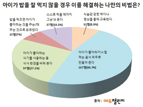 에듀챌린지(대표 김우정)는 지난 4월 6일부터 4월 19일까지 아이챌린지 홈페이지(www.i-challenge.co.kr) ‘맘스리서치’를 통해 ‘아이가 밥을 잘 먹지 않을 경우 이를 해결하는 나만의 비법은?’이라는 주제로 설문 조사를 진행, 358명의 미취학 아이를 둔 엄마들이 설문에 참여했다.
