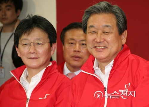 [천지일보=정인선 기자] 새누리당 김무성 대표(오른쪽)와 유승민 원내대표가 29일 서울 여의도 당사 상황실에서 지도부와 함께 4.29 재보선 개표방송을 지켜보며 미소를 보이고 있다.